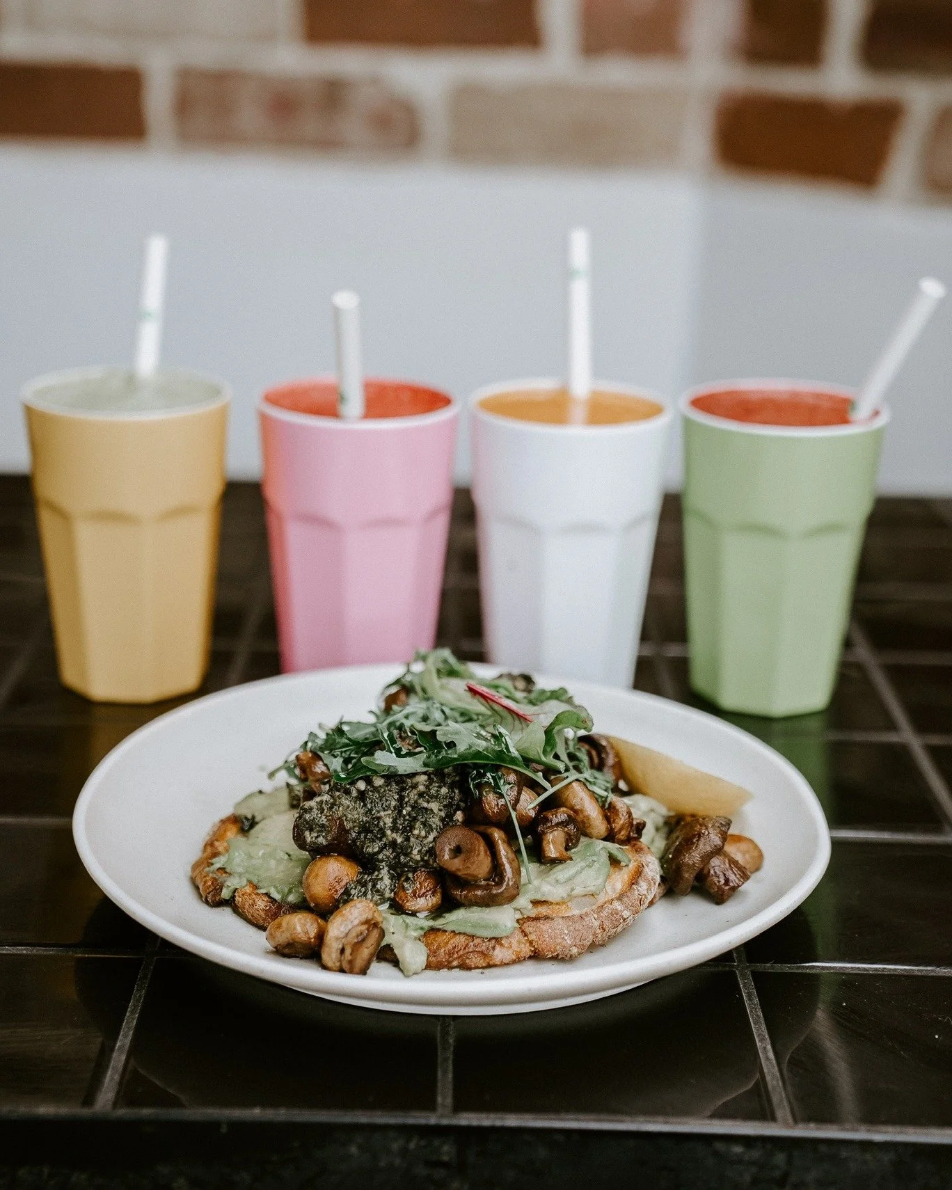 avocado, roast mushroom, Pilgrims’ homemade pesto, local greens, extra virgin olive oil, cracked pepper & a slice of lemon on Berry Bakery’s organic sourdough (V)