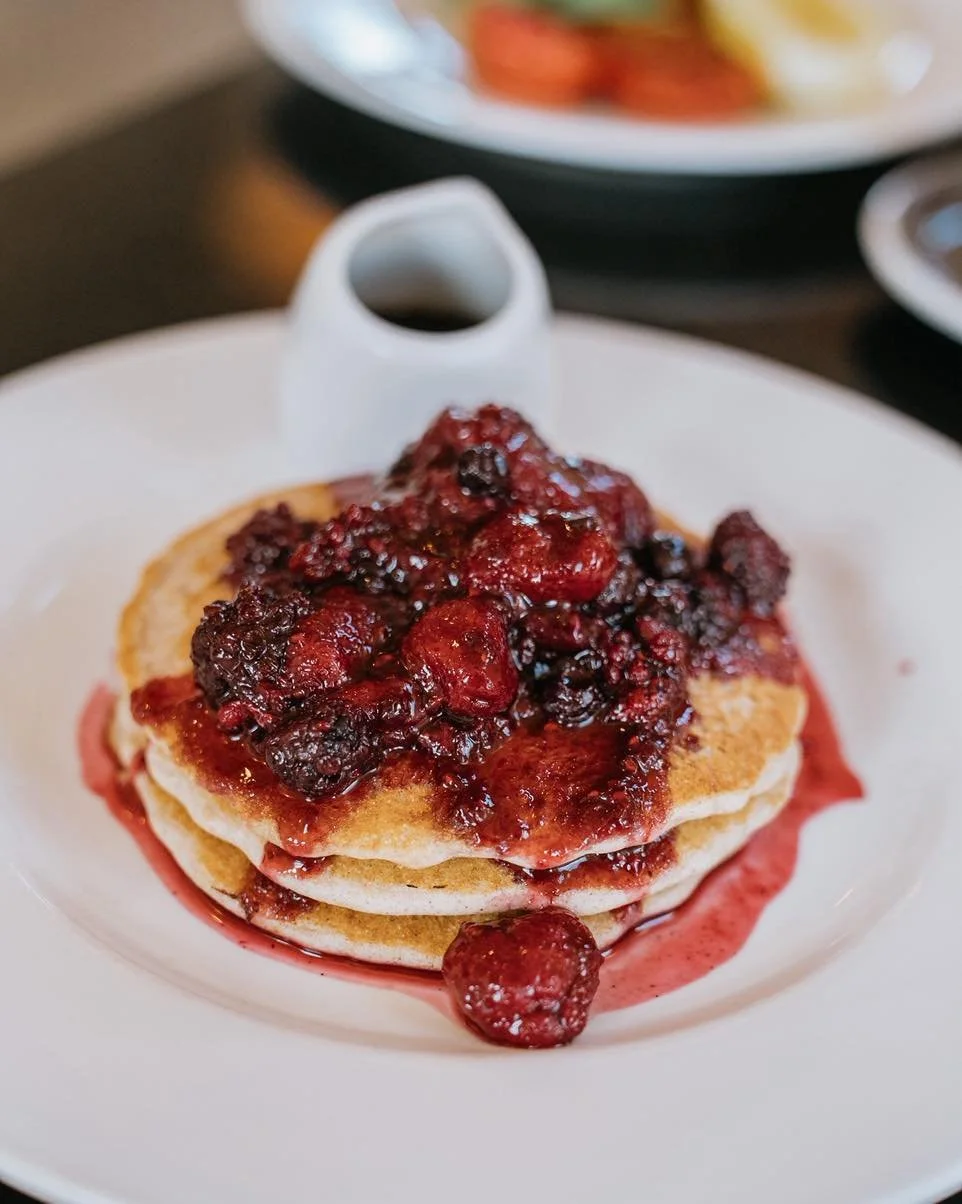 buttermilk pancakes served with fresh banana, yoghurt & organic maple syrup