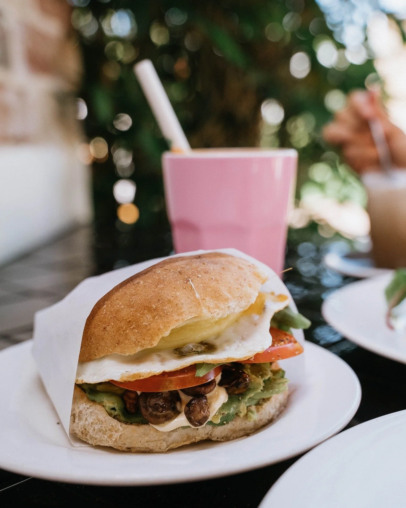 avocado, melted cheese, roast mushroom, roast tomato, fried egg, vegan mayo & local greens on a toasted wholemeal roll